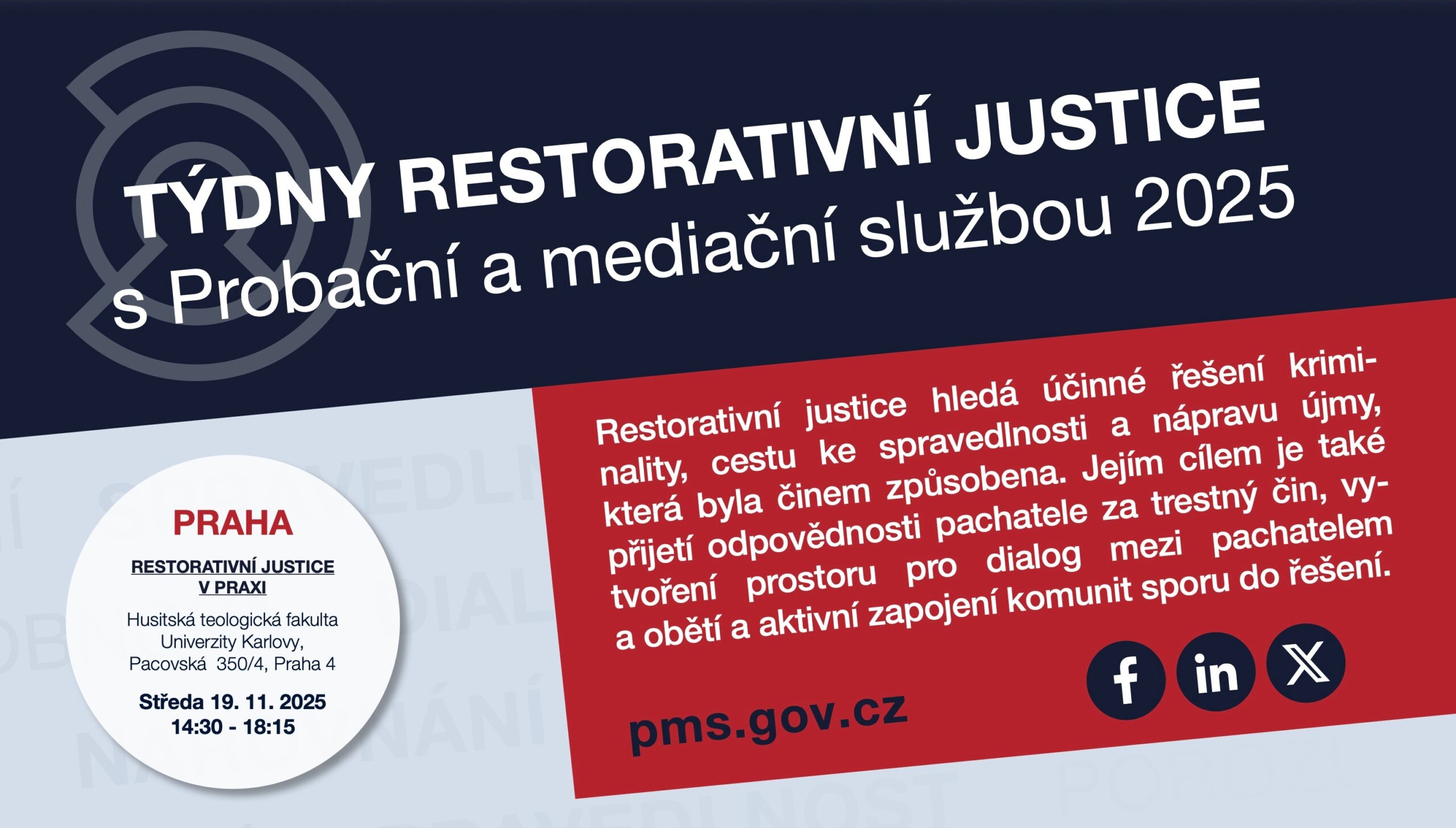 Stejně jako v předchozích letech, i letos připravila Probační a mediační služba program v různých částech Česka, který je součástí Týdne restorativní justice. Společně s Institutem restorativní justice a českými univerzitami jsou nachystané diskuse, kulaté stoly a setkání se studenty hned v několika městech – v Praze, Brně, Plzni, Hradci Králové, Českých Budějovicích, ve Zlíně, v Kroměříži, Opavě a v Ústí nad Labem. Přesný harmonogram, přehled a informační leták najdete v příloze tiskové zprávy.